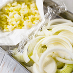 タマネギは繊維を断ち切る方向に、1cmくらいの輪切りにします。セロリは粗みじん切りにします。
