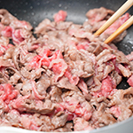オリーブオイルを入れて中火で熱した鍋で牛肉を炒め、色が変わってきたら一度取り出します。
