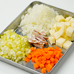 ジャガイモは1cm角、ニンジンは5mm角に切り、タマネギとセロリは粗みじん切り、ベーコンは細切りにします。