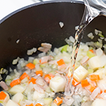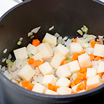 タマネギとセロリが透き通ってきたら、ジャガイモとニンジンを入れて、軽く炒めます。
