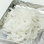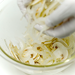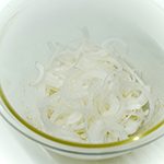 新タマネギは包丁やスライサーで薄切りにし、軽く水にさらした後に水気を切ります。