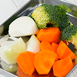 タマネギは串切り、ニンジンは皮をむいて乱切り、ブロッコリーは小房に分けます。