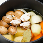 鍋に水とコンソメを入れ、マッシュルーム、ジャガイモ、タマネギ、ニンジン、ローリエを入れて中火で熱します。