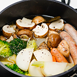 「ポトフ」は肉や野菜を煮込んだフランスの家庭料理で、「火にかけた鍋」という意味があります。今回はソーセージを使い、マッシュルームや野菜から出ただしもあわせて味わえる、具だくさんのポトフに仕上げました。これぞマッシュルームというイメージどおりの洋風・定番メニューで、パーティーや寒い時期のイベントにも大活躍!うま味が溶け出したスープをじっくりと味わえば、真冬でも体の芯までポカポカになりますよ。